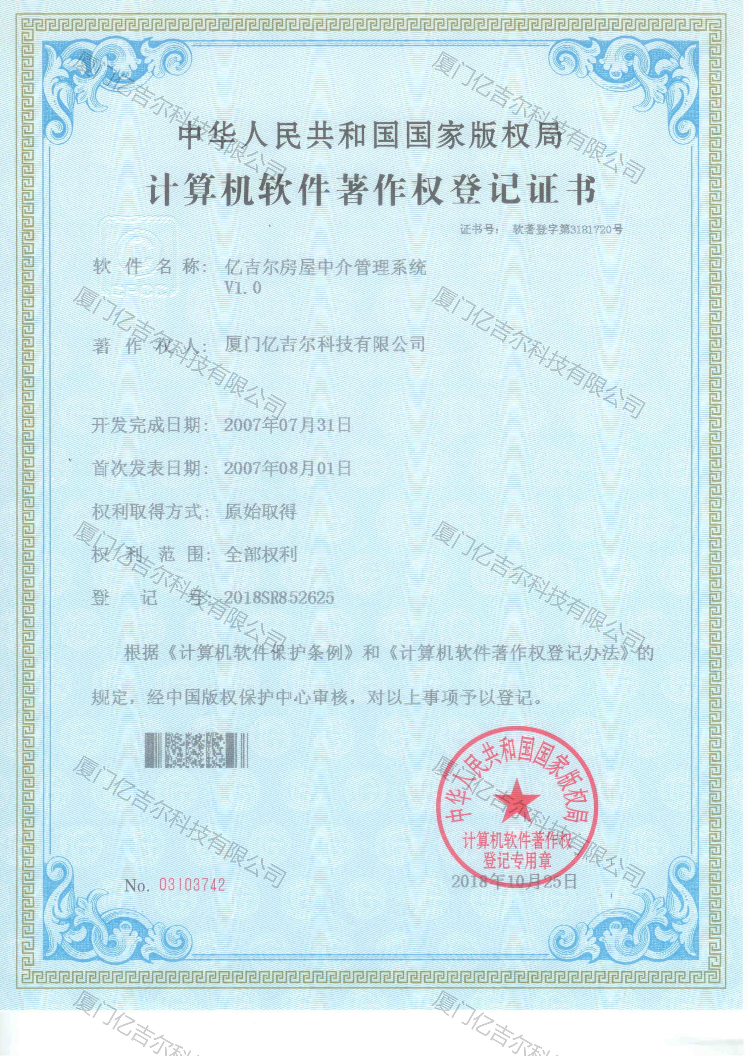 億吉爾房屋中介管理系統(tǒng)軟件著作權(quán)登記證書 發(fā)布日期:2018年10月25日 瀏覽次數(shù):3679 關(guān)鍵字: 公司 1/1億吉爾房屋中介管理系統(tǒng)軟件著作權(quán)登記證書
