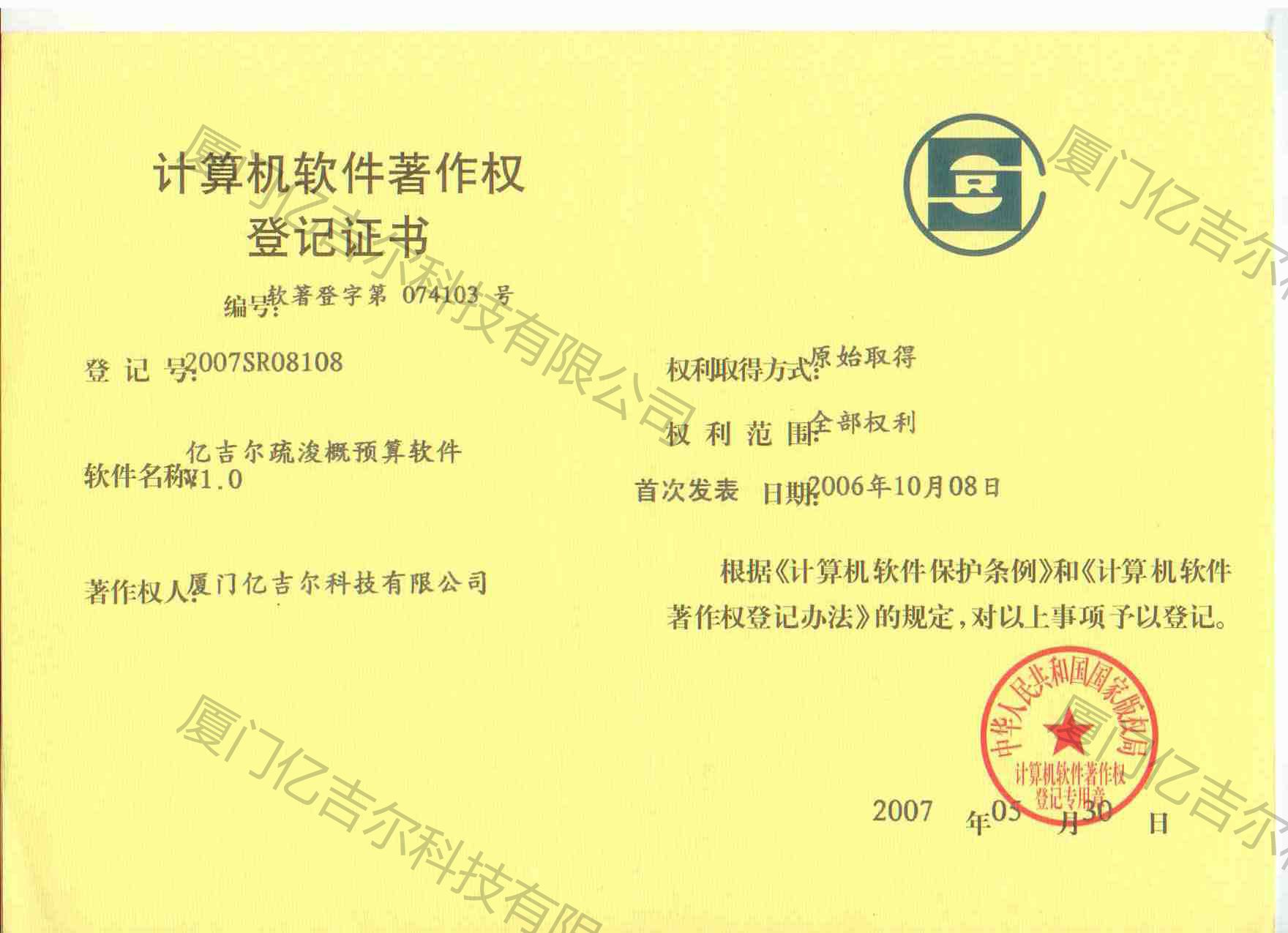 億吉爾疏浚概預(yù)算軟件著作權(quán)登記證書(shū) 發(fā)布日期:2007年05月30日 瀏覽次數(shù):3335 關(guān)鍵字: 公司 1/1億吉爾疏浚概預(yù)算軟件著作權(quán)登記證書(shū)