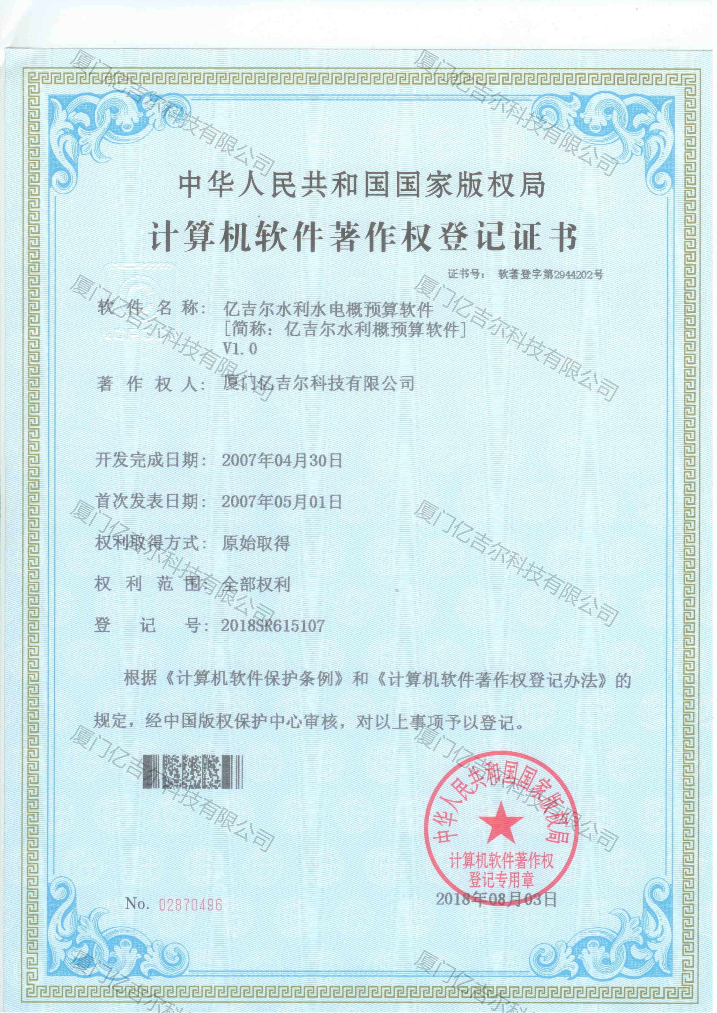 億吉爾水利水電概預(yù)算軟件著作權(quán)登記證書 發(fā)布日期:2018年08月03日 瀏覽次數(shù):3348 關(guān)鍵字: 公司 1/1億吉爾水利水電概預(yù)算軟件著作權(quán)登記證書